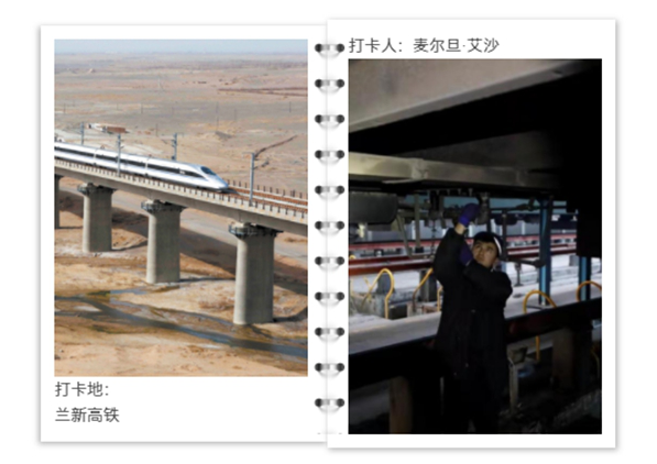 “我叫麥爾旦·艾沙,是中國鐵路烏魯木齊局集團(tuán)有限公司烏魯木齊車輛段的一名‘00后’職工,日常工作是對(duì)入庫的車體進(jìn)行檢查和維修,確保車輛安全、平穩(wěn)地運(yùn)行。對(duì)每個(gè)螺絲我都擰得特別認(rèn)真,現(xiàn)在火車速度越來越快了,對(duì)檢修的要求特別高,修車人要時(shí)刻想著坐車人。今年是我參加工作的第一年,我最大的愿望就是帶著爸媽坐上我檢修的火車去上海旅游,讓爸媽為我驕傲!希望更多維吾爾族兄弟姐妹坐著我檢修的列車走出去看看!”打卡人麥爾旦·艾沙說。