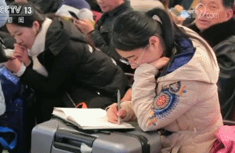 在嘈雜的人群中,我們發(fā)現(xiàn)了一個(gè)有些特別的女孩兒。她正倚著行李箱邊看書邊做注解。交談中我們得知,學(xué)校剛放假,她就急著買票回家了。