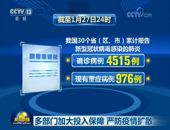 國家衛(wèi)生健康委通報(bào):截至1月27日24時(shí),我國30個(gè)。▍^(qū)、市)累計(jì)報(bào)告確診病例4515例,現(xiàn)有重癥病例976例,累計(jì)死亡病例106例,累計(jì)治愈出院60例。現(xiàn)有疑似病例6973例。