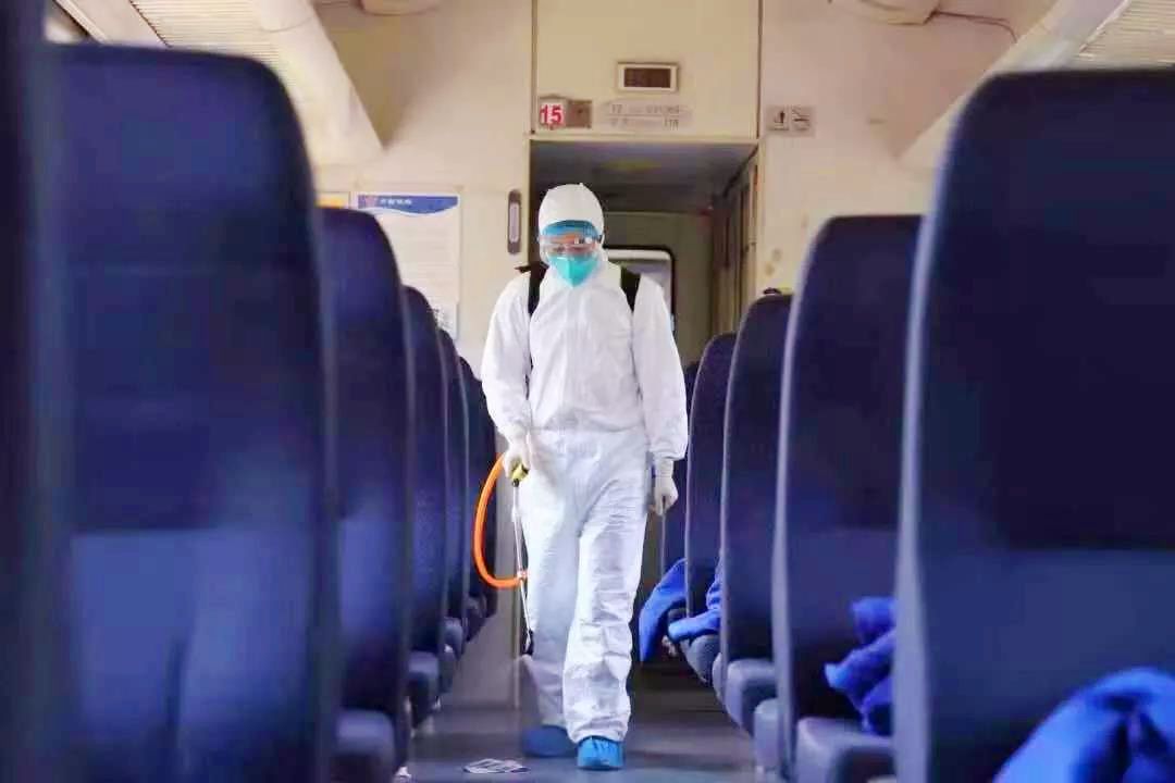 中國鐵路濟(jì)南局集團(tuán)有限公司青島客運(yùn)段團(tuán)員青年在值乘中,做好車輛消毒、體溫監(jiān)測及重點(diǎn)旅客幫扶工作。
