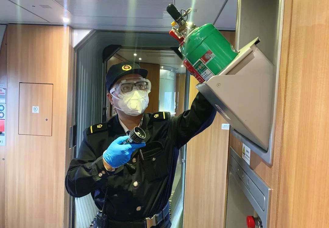 青島動(dòng)車段青年檢查車內(nèi)消防設(shè)施。