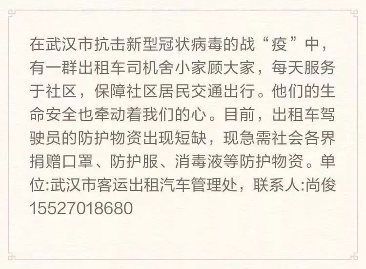 疫情就是命令,防控就是責任。武漢的抗疫進展牽動著陜西省西安市出租汽車集團(以下簡稱“西汽集團”)全體員工的心。1月29日,一封來自武漢大通出租公司的求助信息引起了西汽集團高度關注,信息中提到武漢出租行業(yè)出現(xiàn)防護物資短缺,急需支援。西汽集團得知消息后,立即召開專題會議,作出特別批示:“'一方有難、八方支援',西汽集團要克服一切困難籌集調度物資,千里馳援武漢兄弟單位,保障為城市作貢獻的出租汽車駕駛員生命安全”!