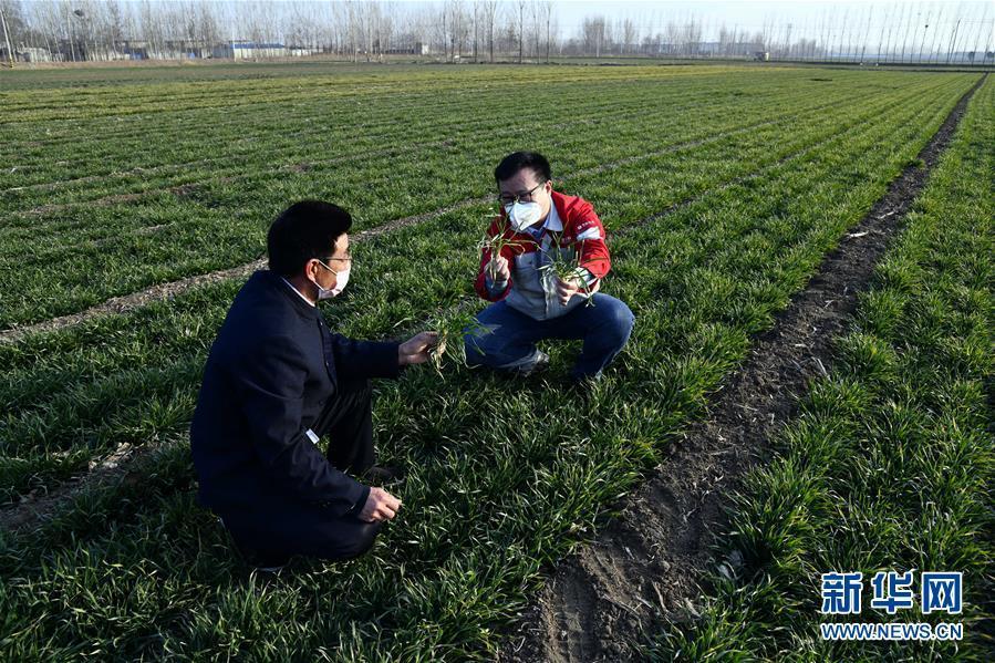 2月13日,在山東省泰安市寧陽縣葛石鎮(zhèn)大夏莊村,豐信公司工作人員(右)在為提供“保姆式”服務(wù)的農(nóng)戶傳授小麥管理知識。新華社記者 郭緒雷 攝