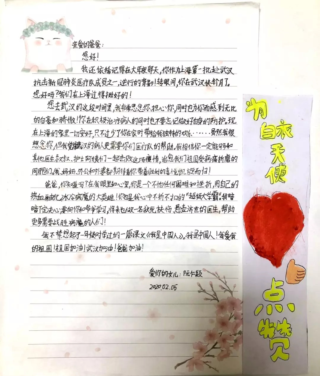 “親愛(ài)的爸爸,現(xiàn)在上海的家里一切安好,雖然我很想念你,但我覺(jué)得武漢的病人更需要你們醫(yī)療隊(duì)的幫助。我、媽媽、外公和外婆都期盼著你帶著勝利的喜悅凱旋而歸!
