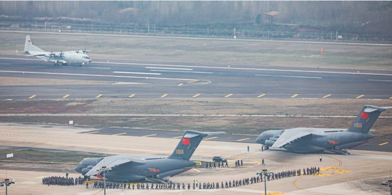 2月13日凌晨,空軍出動包括中國自主研制的6架運(yùn)20在內(nèi)的3型11架運(yùn)輸機(jī),分別從烏魯木齊、沈陽、西寧、天津、張家口、成都、重慶等7地機(jī)場起飛,向武漢空運(yùn)軍隊(duì)支援湖北醫(yī)療隊(duì)隊(duì)員和物資。上午9時30分許,11架運(yùn)輸機(jī)全部抵達(dá)武漢天河機(jī)場。