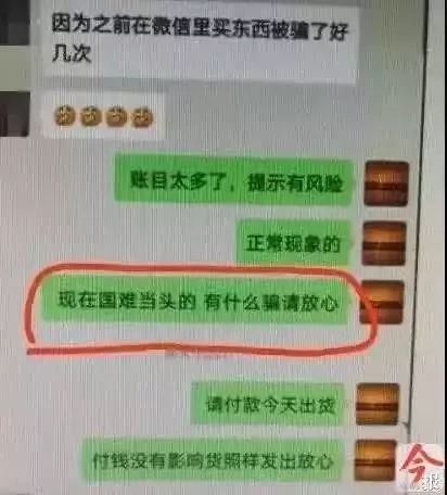▲ 受害者提出疑問,嫌疑人都以“國(guó)難當(dāng)頭”回復(fù)。