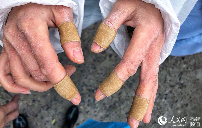 “我每天只能通過視頻和媽媽聊天!敝x小燕每天早出晚歸,母子倆很難見上一面。曾元博說,因為媽媽每天上下班都要進(jìn)行嚴(yán)格消毒,雙手已經(jīng)被干裂出一道道血口!皨寢尩氖忠呀(jīng)干裂得不成樣子了,一使勁就會流血,真讓我們心疼!