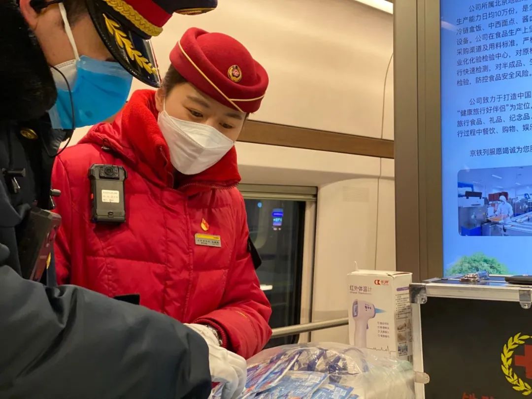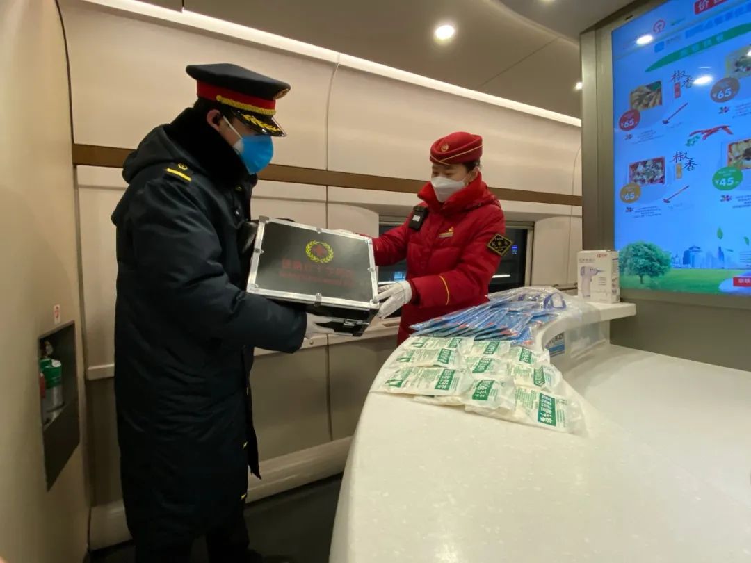 孔維爽:按照防控要求,列車配備應(yīng)急處置藥箱一套,包括一次性醫(yī)用口罩、一次性手套、護(hù)目鏡、體溫計(jì)、防護(hù)服、消毒劑等。