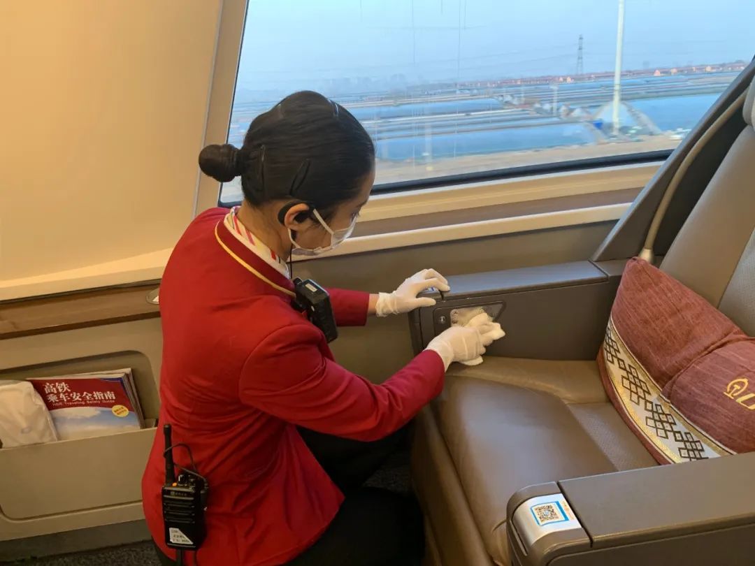 孔維爽:高鐵列車出庫前,鐵路防疫部門對(duì)全車內(nèi)進(jìn)行常規(guī)消毒,庫內(nèi)保潔人員負(fù)責(zé)對(duì)座椅扶手、小桌板、衛(wèi)生間馬桶、衛(wèi)生間門把手、衛(wèi)生間沖水按鈕、衛(wèi)生間門鎖銷、風(fēng)擋隔離端門開關(guān)按鈕、商務(wù)車座椅調(diào)節(jié)按鈕等重點(diǎn)部位進(jìn)行擦拭消毒。班組人員的日常健康狀況、家屬身體情況、行車安全、作業(yè)標(biāo)準(zhǔn)、服務(wù)質(zhì)量、防疫物資使用等,我們進(jìn)行全面監(jiān)督指導(dǎo)。