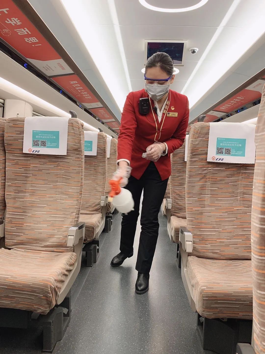 孔維爽:每4小時(shí)全面消毒,每1小時(shí)對(duì)列車門把手、扶手、按鈕等重點(diǎn)部位進(jìn)行消毒。實(shí)際上,根據(jù)車站間距、客流量,我們會(huì)加大消毒次數(shù),特別是旅客頻繁接觸的部位,我們盡可能做到一客一消。