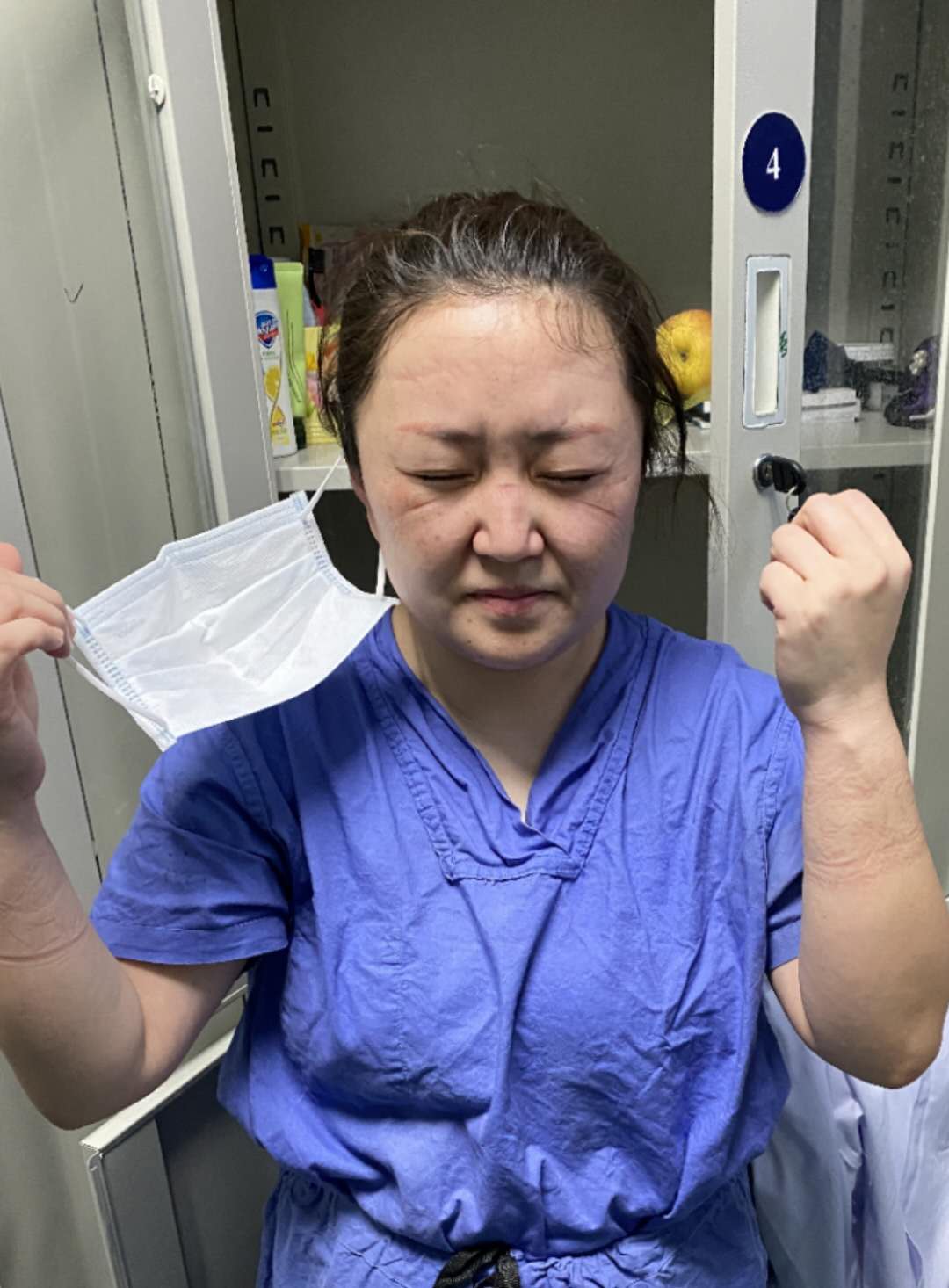 防護(hù)服、N95口罩、護(hù)目鏡、面屏,全副武裝,外面密不透風(fēng),里面是滿(mǎn)滿(mǎn)的水汽。口罩帽子勒得耳朵疼,護(hù)目鏡壓得鼻梁和臉疼,兄弟姐妹對(duì)這些早已習(xí)慣,對(duì)病房環(huán)境的恐懼也逐漸消弭。面對(duì)患者,我們準(zhǔn)確無(wú)誤完成操作,快而不亂,緊張而有序。面對(duì)這樣的我們,患者的心情也逐漸放松,堅(jiān)定著戰(zhàn)勝疾病的信心。