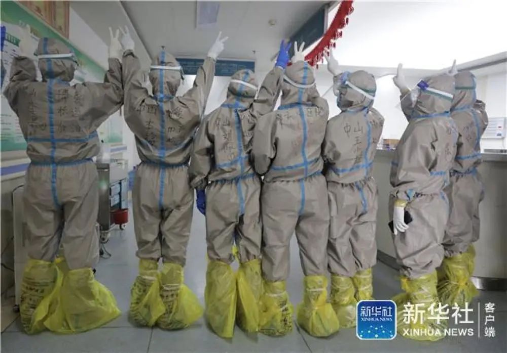 ↑派遣至松滋市人民醫(yī)院工作的廣東醫(yī)療隊(duì)隊(duì)員在防護(hù)服上寫(xiě)下自己名字
