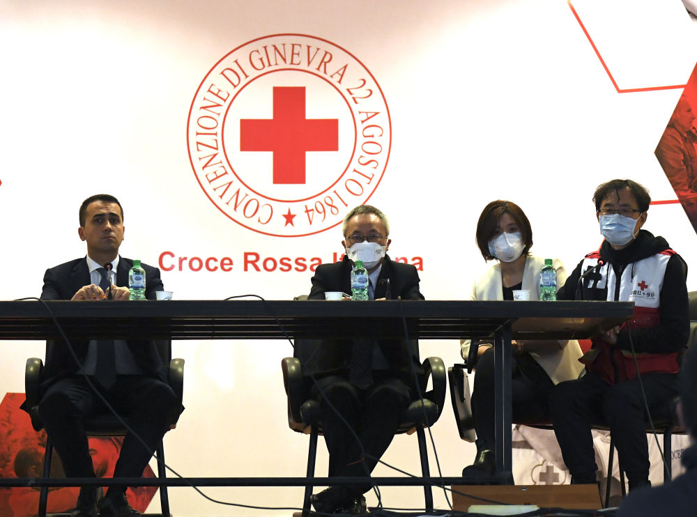 3月13日,在意大利首都羅馬,意大利外長迪馬約(左一)與中國抗疫醫(yī)療專家組成員(右一)出席新聞發(fā)布會(huì)。 新華社發(fā)(阿爾貝托·林格利亞攝)
