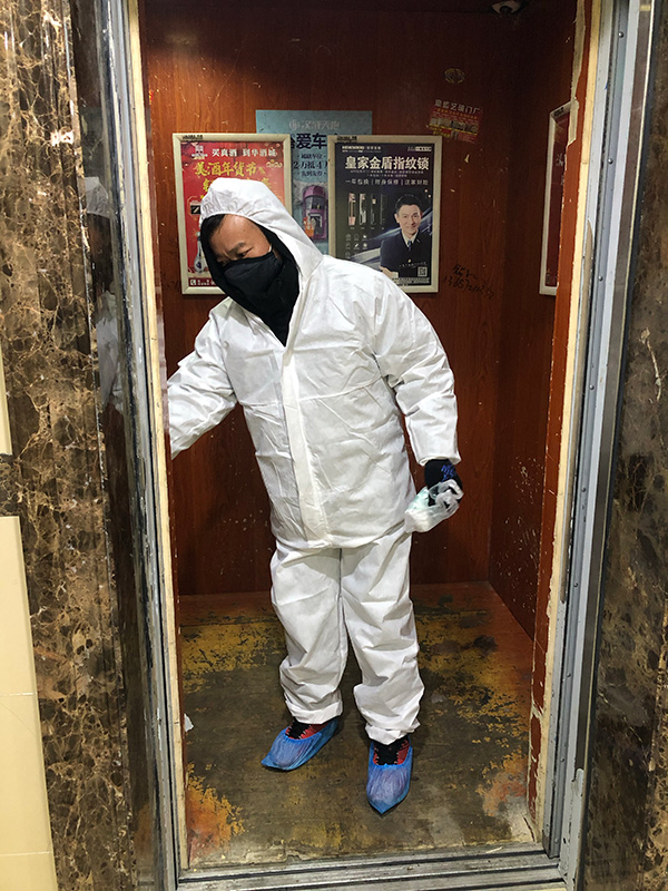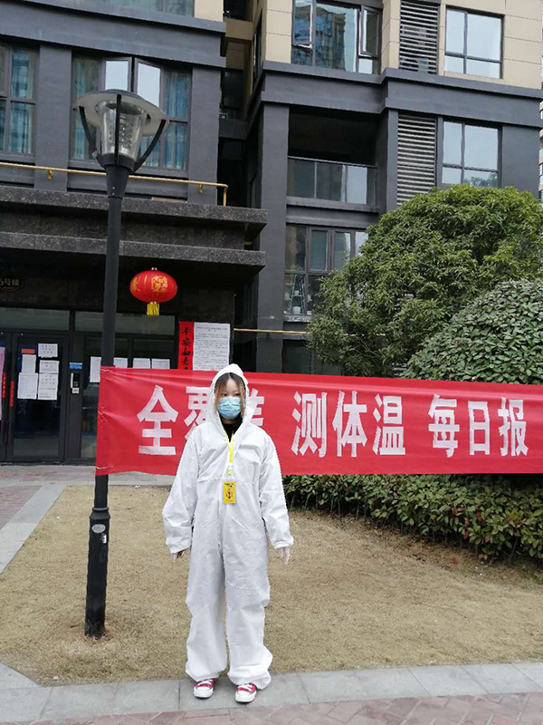 圖文:付洪榮女兒范雨禾在樓棟前值守