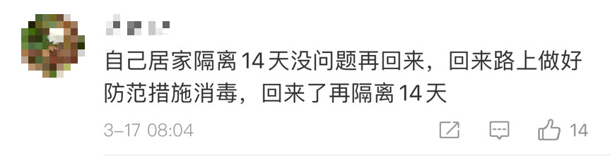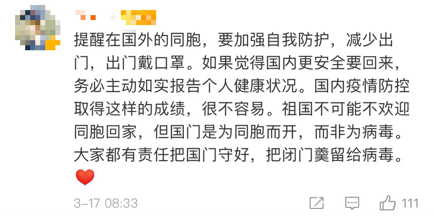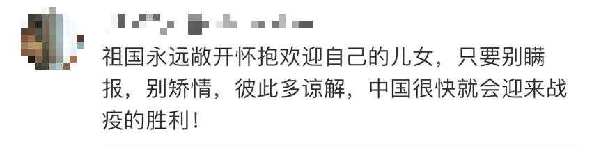 一些網友認為,祖國永遠歡迎自己的兒女回來,但為了防控疫情,歸國人員不應瞞報身體狀況,并要配合國內集中隔離管理!