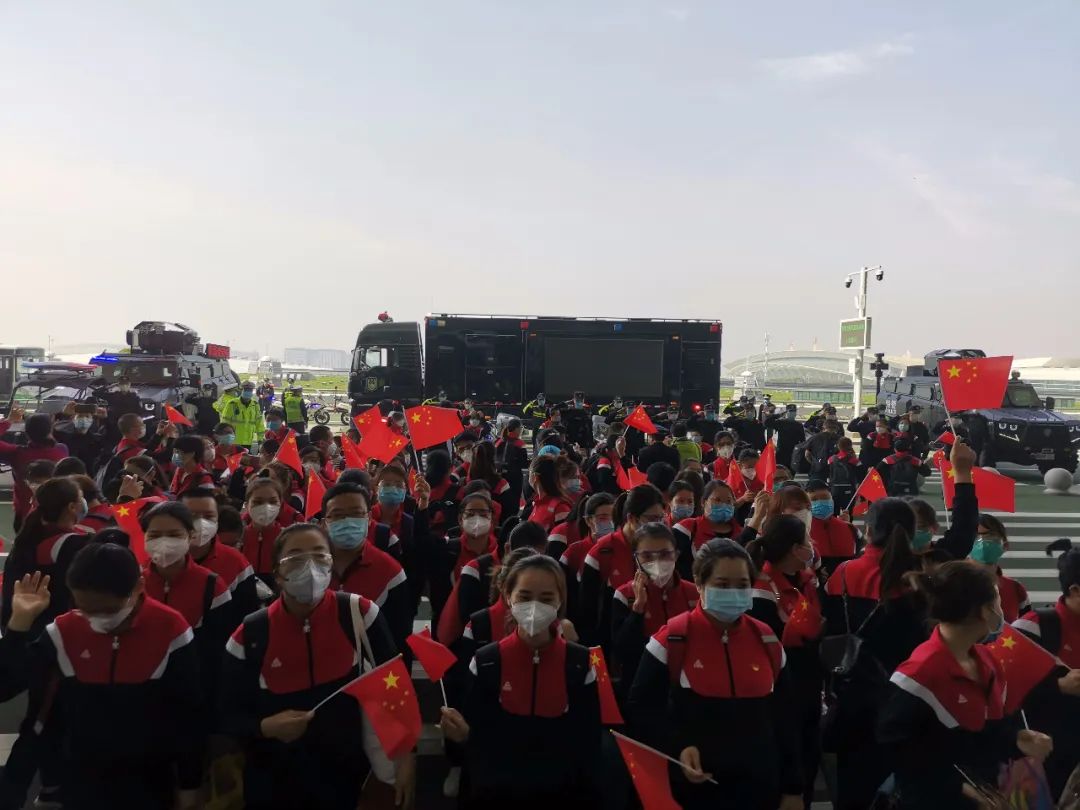 準(zhǔn)備凱旋的海南國家緊急醫(yī)學(xué)救援隊高喊“武漢加油,中國加油!”