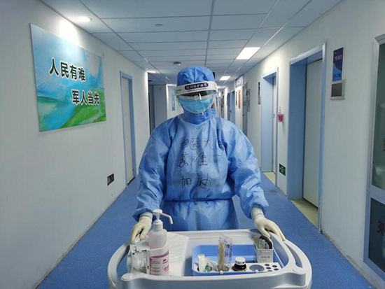 到武漢我被分配在湖北省婦幼保健院光谷院區(qū)感染二科,這是一個(gè)危重病區(qū),收治的大部分都是老年患者。剛到武漢的第二天,我護(hù)理一位耄耋之年的老爺爺,在打針時(shí),他隨口說了一句有沒有凳子,站著吃飯很費(fèi)力。打完針,我就急忙給他找了個(gè)凳子送過去。老爺爺說自己是個(gè)退伍老兵,說完鄭重其事地站起來向我敬了一個(gè)軍禮。那一刻,我不由自主地站直了身子,握緊了右拳,心中默念:“加油!”那一刻,我覺得我全身每一顆細(xì)胞都熱血沸騰!
