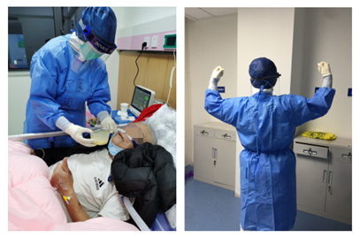 記得剛開始穿防護(hù)服進(jìn)病房,小伙伴們緊張害怕,緊張自己的防護(hù)服是否嚴(yán)密包裹自己,是否有任何暴露的風(fēng)險(xiǎn)。害怕的是,因?yàn)槭堑谝淮谓邮詹∪,能否合理安排好工作秩序,能否可以和病人順利交流等諸多問題。隨著時(shí)間的推移,在摸索中一步步前進(jìn),轉(zhuǎn)眼間,一個(gè)月快過去了,我們已經(jīng)適應(yīng)了穿防護(hù)服的日子,適應(yīng)了每天過的跟打仗似的日子。
