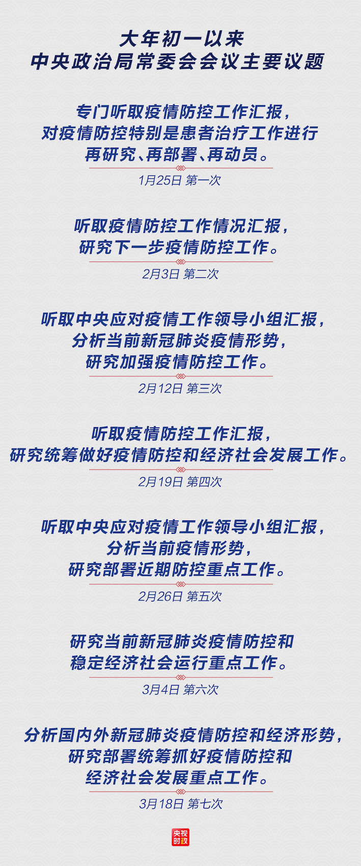 從1月25日(農(nóng)歷大年初一)開始,中央政治局常委會會議以平均不到8天一次的節(jié)奏召開。透過已經(jīng)召開的7次會議,可以看到議題的變與不變。