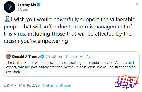 當(dāng)?shù)貢r(shí)間17日,美國總統(tǒng)特朗普公然將肆虐全球的新型冠狀病毒稱作“中國病毒”,試圖甩鍋中國以擺脫美國內(nèi)對(duì)其抗疫不力的指責(zé)。特朗普的無底線言論,引起海外華僑華人的堅(jiān)決反對(duì),前NBA華裔球星林書豪也連發(fā)數(shù)條推文批評(píng)特朗普的表態(tài)帶有種族歧視含義,指責(zé)美國現(xiàn)任政府的防疫工作開展不力。