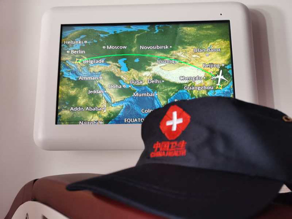 這是3月21日在廣州飛往塞爾維亞首都貝爾格萊德的專機(jī)上拍攝的中國抗疫醫(yī)療專家組成員的帽子,后面的電子屏幕顯示著廣州至貝爾格萊德之間的航路圖。
