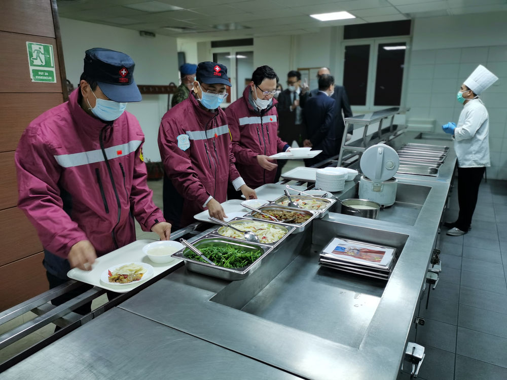 塞方軍人搬運(yùn)中國抗疫醫(yī)療專家組帶來的醫(yī)療物資。