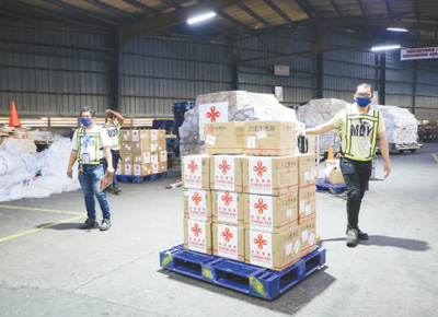 3月21日,搭載中國政府援助菲律賓醫(yī)療物資的包機抵達馬尼拉國際機場。圖為當?shù)貦C場工作人員正在搬運物資。中國駐菲律賓大使館供圖