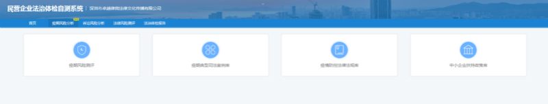 “三庫一檢”是指在深圳市司法局主辦的全國(guó)首家“民營(yíng)法治體檢自測(cè)系統(tǒng)”上增加疫情期間典型司法案例庫、防控法律法規(guī)庫、中小企業(yè)扶持政策庫和疫情期間風(fēng)險(xiǎn)評(píng)測(cè)功能。其中,疫情期間風(fēng)險(xiǎn)評(píng)測(cè)包含合同與侵權(quán)、勞動(dòng)與工資、經(jīng)營(yíng)與稅務(wù)、刑事與行政四大模塊。企業(yè)通過自主填答疫情期間民營(yíng)企業(yè)高發(fā)的法律風(fēng)險(xiǎn)測(cè)試題,即可智能生成包含風(fēng)險(xiǎn)等級(jí)評(píng)估、法律風(fēng)險(xiǎn)點(diǎn)提示、風(fēng)險(xiǎn)防范建議等在內(nèi)的“法治體檢”報(bào)告;典型司法案例庫收集了新冠肺炎疫情期間各地法院和檢察院發(fā)布的典型案例,為中小企業(yè)可能面臨的訴訟風(fēng)險(xiǎn)提供參考;防控法律法規(guī)庫根據(jù)中央、地方及不同領(lǐng)域行業(yè)對(duì)疫情相關(guān)法律文件進(jìn)行劃分和匯編,為中小企業(yè)查詢相關(guān)法律法規(guī)提供便利;中小企業(yè)扶持政策庫則收集了疫情期間國(guó)家和地方針對(duì)中小企業(yè)出臺(tái)的各項(xiàng)支持政策,包括降低用電用氣成本、階段性減免社保費(fèi)、緩繳住房公積金等,為企業(yè)在疫情期間獲得政策支持、降低損失、安全渡過難關(guān)提供指引。以上功能仍以線上服務(wù)、智能輔助服務(wù)、免費(fèi)服務(wù)為主。