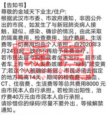 3月25日,武漢當(dāng)?shù)亓鱾鞯亩鄠(gè)小區(qū)給業(yè)主(住戶)的《告知書》稱,根據(jù)武漢市委、市政府通知,24日起對(duì)非公外出發(fā)生新冠肺炎“接觸、疑似、感染、確診”等四類人員,武漢市政府不再給予免費(fèi)治療,相關(guān)隔離、檢查、住宿等費(fèi)用8000元,確診患者治療費(fèi)用40萬元由市民自己承擔(dān)。