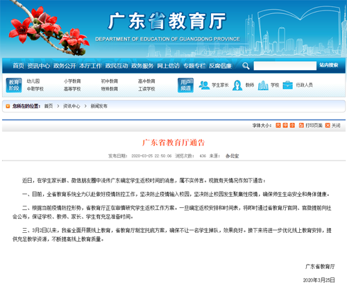 近幾日,在廣東當(dāng)?shù)丶议L群、朋友圈中流傳著“廣東確定學(xué)生返校時(shí)間”的消息。辟謠:廣東省教育廳3月25日在其官網(wǎng)發(fā)布通告稱,根據(jù)當(dāng)前疫情防控形勢,廣東省教育廳正在審慎研究學(xué)生返校工作方案。一旦確定返校安排和時(shí)間表,將即時(shí)通過省教育廳官網(wǎng)、官微提前向社會(huì)公布,保證學(xué)校、教師、家長、學(xué)生有充足準(zhǔn)備時(shí)間。