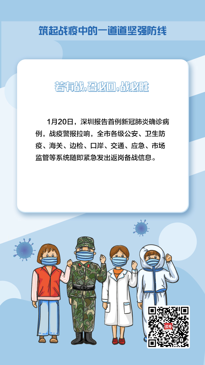 “在深圳的各位同事請(qǐng)立即返崗。各單位請(qǐng)馬上通知休假人員,落實(shí)人員歸隊(duì)!1月20日,深圳報(bào)告首例新冠肺炎確診病例,戰(zhàn)疫警報(bào)拉響,全市各級(jí)公安、衛(wèi)生防疫、海關(guān)、邊檢、口岸、交通、應(yīng)急、市場(chǎng)監(jiān)管等系統(tǒng)隨即緊急發(fā)出返崗備戰(zhàn)信息。