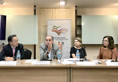 2月14日,中國(guó)駐里約熱內(nèi)盧總領(lǐng)事李楊(左一)正在巴西金磚國(guó)家政策中心舉行的“新冠肺炎疫情及其國(guó)際影響”研討會(huì)進(jìn)行情況介紹。