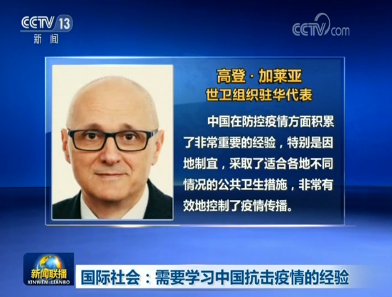 世衛(wèi)組織5日的報(bào)告援引世衛(wèi)組織駐華代表高登·加萊亞的話說,中國在防控疫情方面積累了非常重要的經(jīng)驗(yàn),特別是因地制宜,采取了適合各地不同情況的公共衛(wèi)生措施,非常有效地控制了疫情傳播。加萊亞表示,中國人民為遏制疫情傳播做出巨大努力,產(chǎn)生積極成效。各國應(yīng)共同協(xié)作分享抗疫經(jīng)驗(yàn)和疫情信息,互相借鑒學(xué)習(xí),采取及時(shí)有效的防控措施。