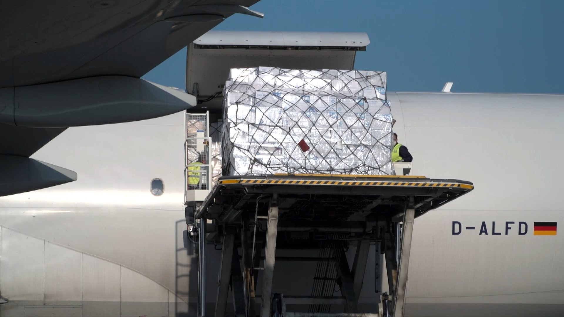 △德國(guó)漢莎航空運(yùn)送的一批800萬(wàn)只中國(guó)口罩運(yùn)抵慕尼黑機(jī)場(chǎng)(圖片來(lái)源:CGTN)