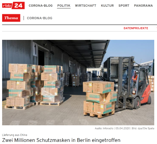 △來(lái)自中國(guó)的交貨 200萬(wàn)件防護(hù)口罩抵達(dá)德國(guó)柏林(圖片來(lái)源:德國(guó)rbb官網(wǎng))