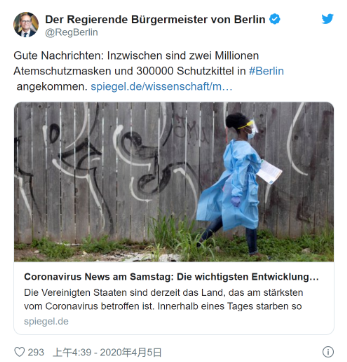 德國(guó)參議院發(fā)言人Melanie Reinsch5日上午表示,這批貨物由德國(guó)聯(lián)邦國(guó)防軍送至柏林。柏林市長(zhǎng)邁克爾·穆勒(Michael Mller)也在其個(gè)人社交賬號(hào)上表示這是一個(gè)“好消息”。