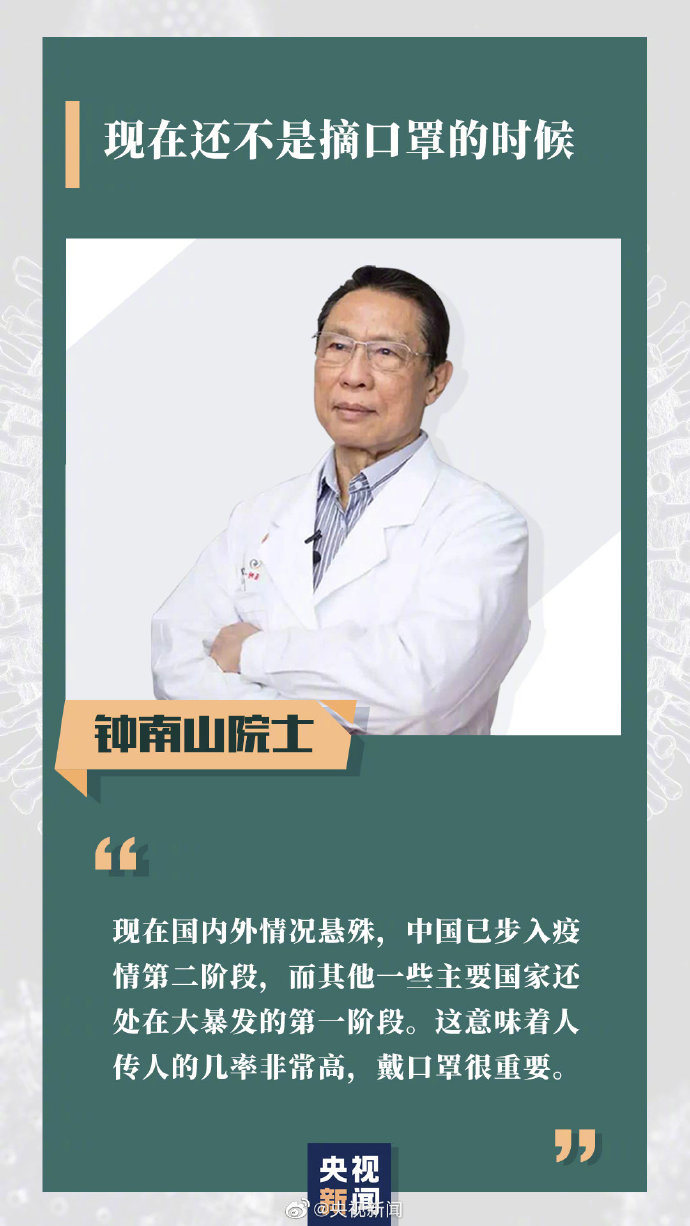 鐘南山:現(xiàn)在國內(nèi)外情況懸殊,中國由于采取了非常果斷的措施,已步入疫情第二階段,而其他一些主要國家還處在大暴發(fā)的第一階段,且仍在向上攀升。這意味著人傳人的幾率非常高,確診病例增加非?。戴口罩仍是很重要的自我防護手段,但在疫情不嚴重的地區(qū),人少的地方或空曠場所,倒不見得必須戴。