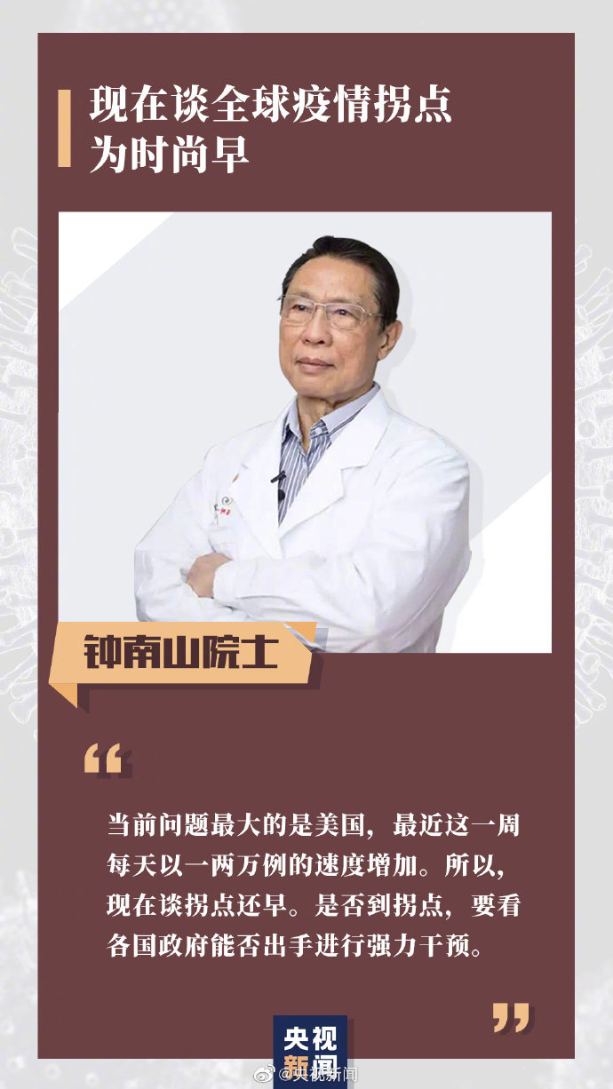 鐘南山:從全球看,原來疫情的“震中”在歐洲,特別是西班牙和意大利,現(xiàn)在還包括德國、法國和英國。當前問題最大的是美國,最近一周,美國的確診病例數(shù)字在以每天1至2萬的速度增加,目前預測全球疫情何時出現(xiàn)“拐點”為時尚早。可以說,能否出現(xiàn)“拐點”,主要要看各國政府能不能出手進行強力干預。其他國家有很多不可測的因素,按照目前這個形勢發(fā)展下去,恐怕還需要兩周。