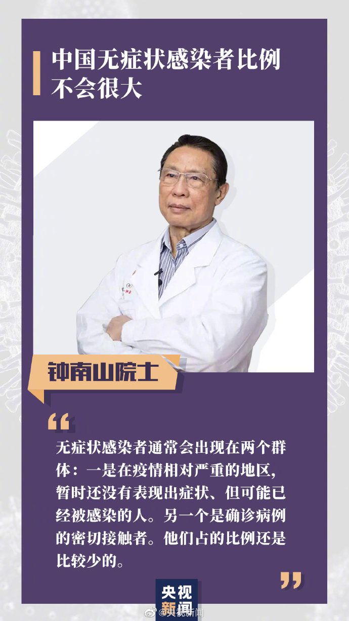 鐘南山:無癥狀感染者不會憑空產(chǎn)生,通常會出現(xiàn)在兩個群體:一是在疫情相對嚴重的地區(qū),暫時還沒有表現(xiàn)出癥狀、但可能已經(jīng)被感染的人;另一個是確診病例的密切接觸者,他們所占比例比較小。無癥狀感染者也有兩個概念,一類是開始沒有癥狀,但后來會逐漸發(fā)展到有癥狀,這類患者肯定具有傳染性;另一類是在相當長的觀察過程中,始終沒有癥狀,但核酸檢測呈陽性。這類患者的傳染性,我們正在研究。但根據(jù)新冠病毒的特性,一旦出現(xiàn)癥狀,傳染性就比較強,所以將無癥狀感染者進行隔離觀察是正確的。