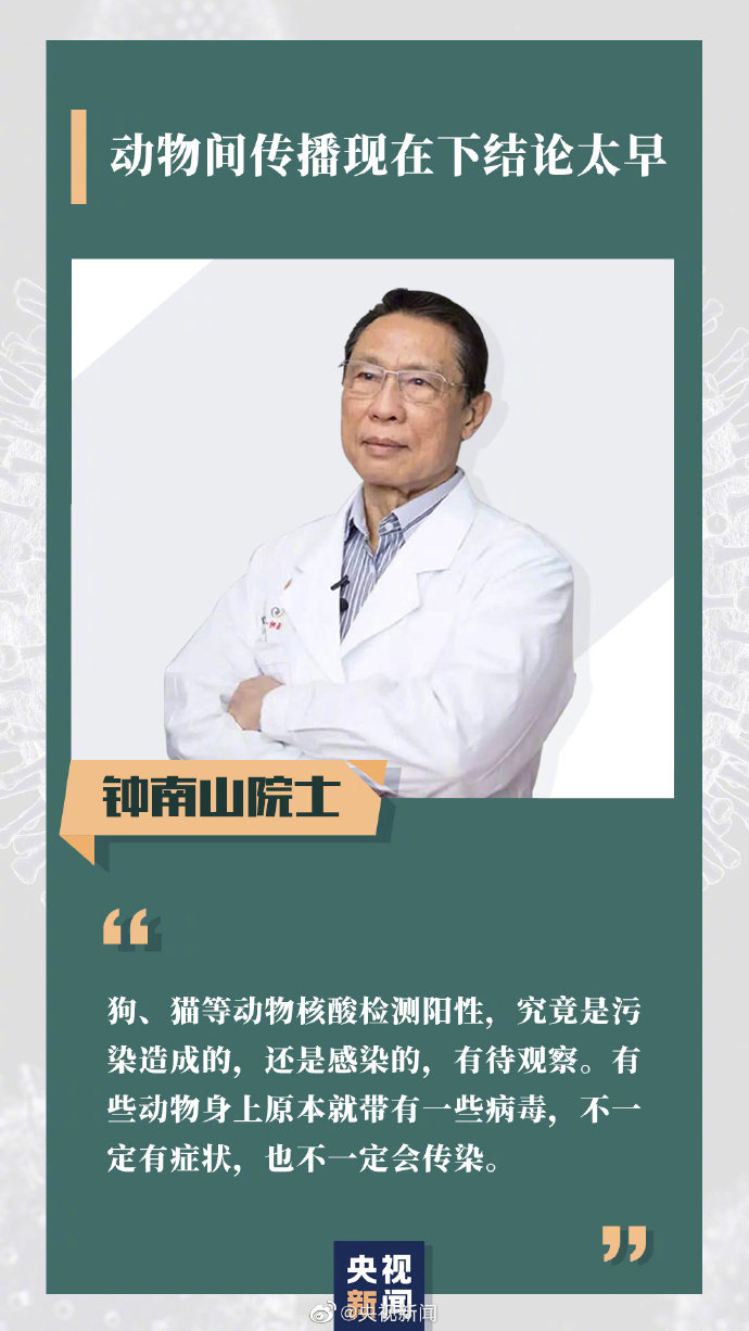 鐘南山:狗、貓、老虎等一些動物核酸檢測陽性,究竟是污染造成的,還是感染的,還有待觀察。有些動物身上原本就帶有一些病毒,不一定有癥狀,也不一定會傳染。現(xiàn)在認為這些動物身上的新冠病毒既能傳染人,又能傳染動物,而且都能致病,這個結(jié)論為時過早。