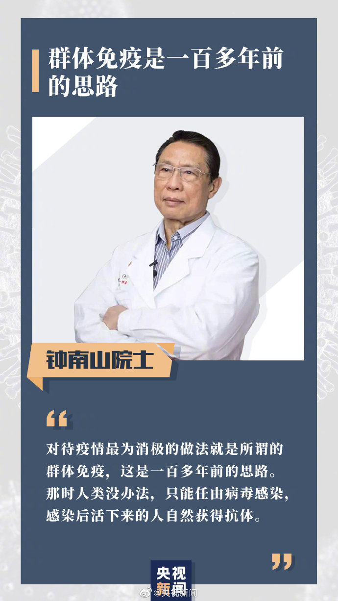 鐘南山:對待疫情最為消極的做法就是所謂“群體免疫”,這是一百多年前的思路。那時人類沒有什么辦法,只能任由病毒感染,感染后活下來的人自然獲得抗體,我不贊同再用這種方法應對新冠病毒。在過去一百多年里,人類取得很大進步,有很多辦法預防,不需要再用自然免疫、群體免疫。