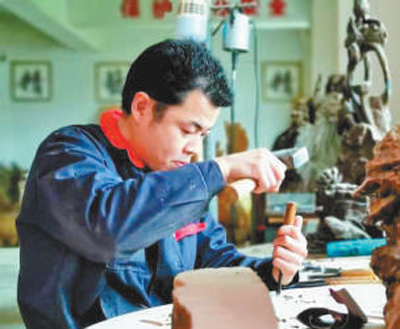 邊帶徒弟,邊練技藝。奉湘波先后獲得湖南省及全國殘疾人技能比賽的大獎,被評為技術(shù)能手。在一塊色澤灰暗的木墩上,刻刀上下翻飛,刀起刀落,木材特有的清香擴(kuò)散,圖案慢慢呈現(xiàn)。奉湘波給我們展示了一下精湛的技藝。