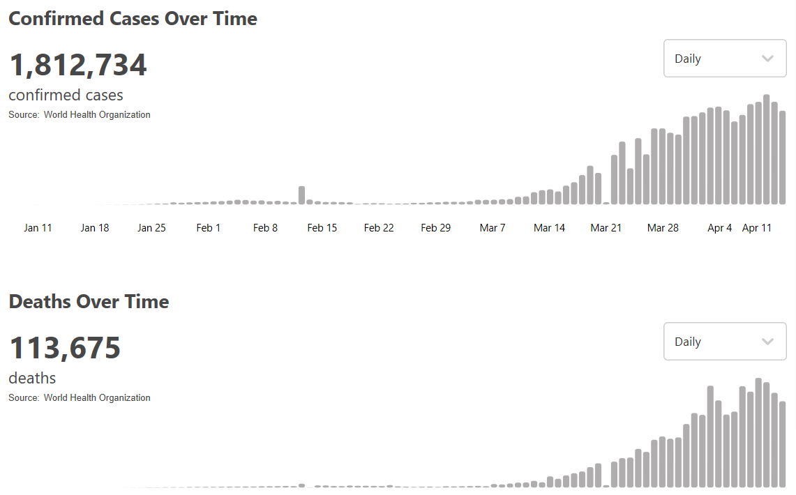 根據(jù)世衛(wèi)組織最新實(shí)時(shí)統(tǒng)計(jì)數(shù)據(jù),目前全球確診新冠肺炎1812734例,死亡113675例,中國以外超過172萬例