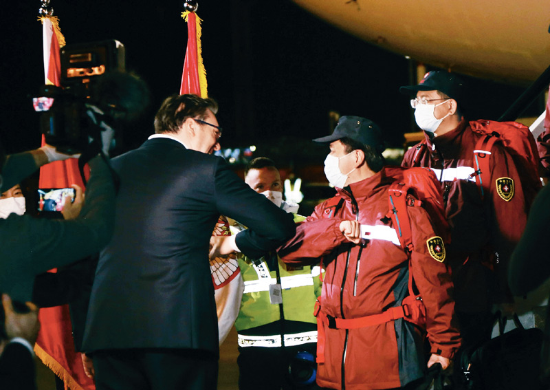2020年3月21日,在塞爾維亞首都貝爾格萊德,前來(lái)迎接的塞爾維亞總統(tǒng)武契奇(左)與中國(guó)援助塞爾維亞抗疫醫(yī)療專家組成員“碰肘”致意。6名中國(guó)專家當(dāng)天抵達(dá)貝爾格萊德,一批由中國(guó)政府捐贈(zèng)的醫(yī)療物資也同機(jī)抵達(dá)。 新華社記者 石中玉/攝