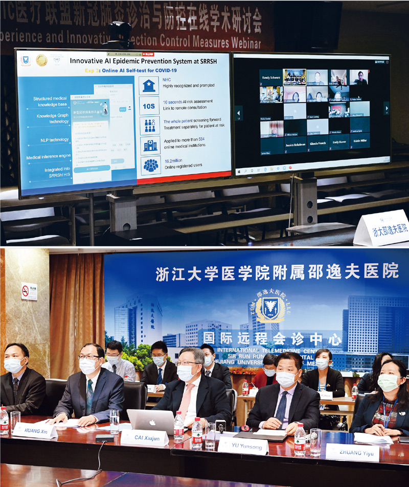 2020年3月27日,在浙江大學(xué)醫(yī)學(xué)院附屬邵逸夫醫(yī)院慶春院區(qū),舉行了一場(chǎng)由杭州、武漢、荊門三地,美國(guó)、韓國(guó)、阿聯(lián)酋、印度、墨西哥等多國(guó)醫(yī)療機(jī)構(gòu)參加的國(guó)際遠(yuǎn)程視頻會(huì)議,向全球共享抗擊新冠肺炎疫情的中國(guó)方案,助力國(guó)際合作戰(zhàn)“疫”。 中新社記者 張茵/攝
