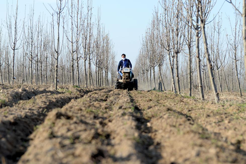 ↑3月18日,孫勇在承包的苗木基地內(nèi)耕地。