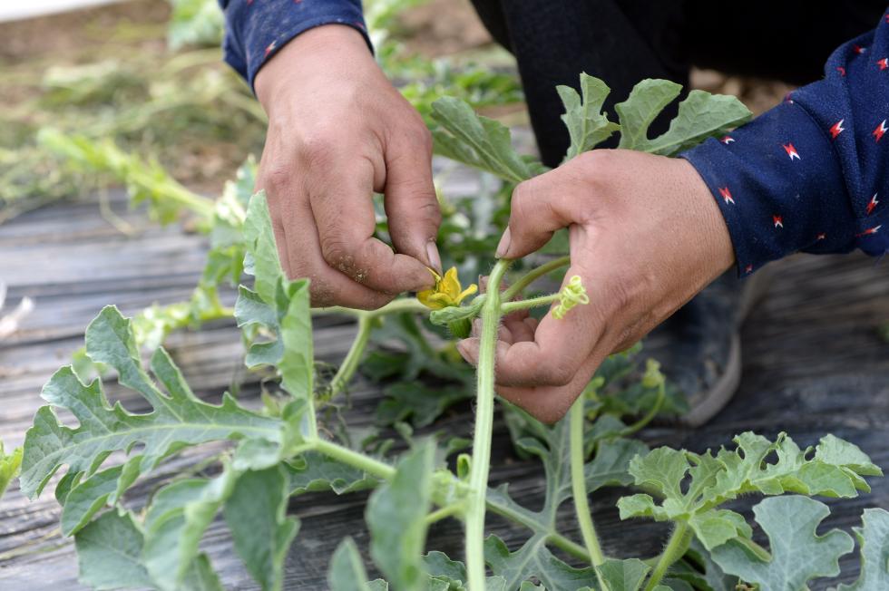 ↑4月2日,孫勇在大棚內(nèi)給西瓜授粉。