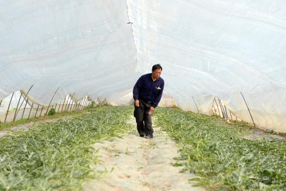 ↑4月2日,孫勇在大棚內(nèi)查看西瓜長勢。