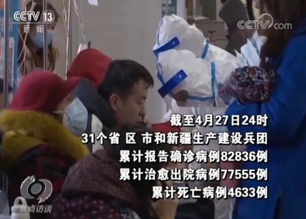 這次疫情是新中國成立以來,在我國發(fā)生的傳播速度最快、感染范圍最廣、防控難度最大的一次重大突發(fā)公共衛(wèi)生事件。截至4月27日24時(shí),31個(gè)。▍^(qū)、市)和新疆生產(chǎn)建設(shè)兵團(tuán)累計(jì)報(bào)告確診病例82836例,累計(jì)治愈出院病例77555例,累計(jì)死亡病例4633例。