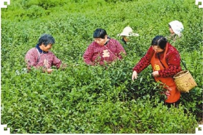 貧困戶陳霞和村里姐妹們?cè)缭缵s來(lái)采摘春茶,臉上綻放著春花般幸福的笑容!懊髑安,貴如金!彼浑p手左右開弓,不停地在茶叢中翻飛輕點(diǎn),采摘芽苞,并笑言,一季春茶采下來(lái)能增收三千多塊。
